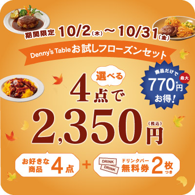 10月2日(火)~10月31日(金)限定!Denny's Table お試しフローズンセット!~選べる商品4点とドリンク無料券2枚付いて2,350円(税込)