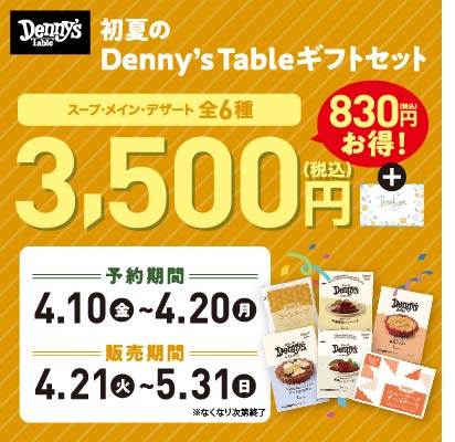 デニーズのオリジナル食品ブランド「Denny's Table」何気ない食卓が、かけがえのない時間になる、ちょっとステキなひとときをDenny's Tableが演出します。 お知らせ 2026.4.21 デニーズ店内で大好評の「飯田商店監修 味噌らぁ麺」が4/21(水)~Denny's Tableに登場! 2026.4.21 初夏のDenny's Tableギフトセット~スープ・メイン・デザート全6種とメッセージカード付で3,500円(税込)~ 2026.4.1 \毎月1日・11日はDenny's Tableの日!/4月は人気のハンバーグやカレーがワンコイン500円(税込)で楽しめる! 2025.7.30 Denny’s Table(デニーズテーブル)楽天市場店 閉店のお知らせ 2025.3.5 2024年デニーズテーブル年間売れ筋ランキングを発表!特に人気の商品TOP5を紹介しています。 2024.2.21 おうちやオフィスのランチに!食器いらず、カップのまま食べられる本格アジアごはんなどデニーズの冷凍食品7商品 3月1日(金)より販売開始