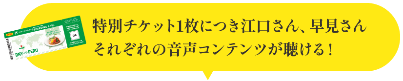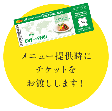 対象のハンバーグメニューをご注文いただいたお客様に、 人気キャラクターを担当する声優のオリジナル音声コンテンツが楽しめる 「特別チケット」を特典としてプレゼントします。 チケットは、各ハンバーグメニューを紹介する内容となっており、 記載の二次元コードを読み取ることで、 そのハンバーグをより美味しく味わえる 限定音声コンテンツをお楽しみいただけます。 まるで旅に出る前の搭乗券のようなワクワク感とともに、 耳でも楽しむ新しいハンバーグ体験を提供します。